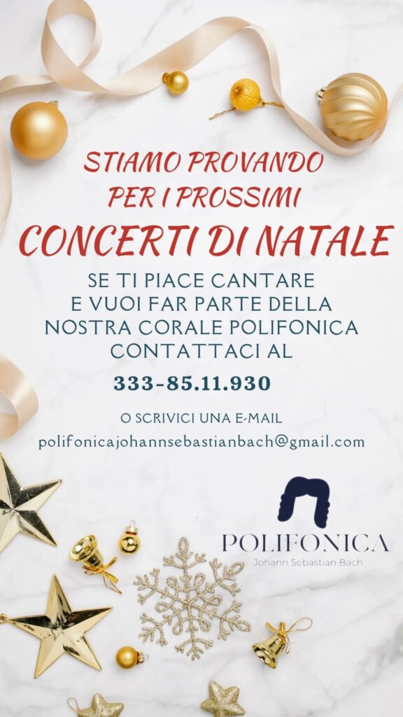 La Polifonica “J. S. Bach” di Conversano (BA) è al lavoro per preparare i suoi prossimi concerti di Natale. A chiunque piaccia cantare e a chiunque voglia far parte della corale è rivolto un caloroso invito di partecipazione e sarà il benvenuto in questa realtà. Le prove si svolgono con cadenza settimanale presso la sede della Polifonica a Conversano (BA) dalle 19:30 alle 21:00. La partecipazione è totalmente libera e gratuita. E’ possibile contattare l’organizzazione al 333-85.11.930 o scrivendo all’indirizzo e-mail polifonicajohannsebastianbach@gmail.com