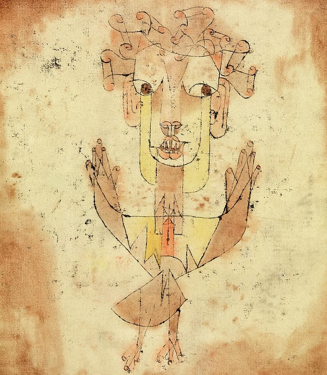 “C’è un quadro di Klee che s’intitola Angelus Novus. Vi si trova un angelo che sembra in atto di allontanarsi da qualcosa su cui fissa lo sguardo. Ha gli occhi spalancati, la bocca aperta, le ali distese. Ha il viso rivolto al passato. Dove ci appare una catena di eventi, egli vede un’unica catastrofe, che accumula senza tregua rovine su rovine, e le rovescia ai suoi piedi. Egli vorrebbe trattenersi, destare i morti e ricomporre quel che è andato in frantumi. Ma una tempesta spira dal paradiso; ed essa investe le sua ali con tale violenza, che egli non può più richiuderle. La tempesta lo spinge irresistibilmente verso il futuro, a cui volge le spalle, mentre il cumulo delle rovine sale davanti a lui sino al cielo. Questa tempesta è ciò che chiamiamo progresso”. Walter Benjamin.