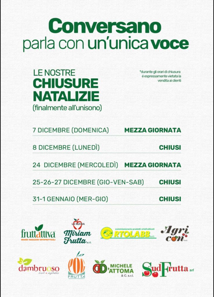 E’ bastata la determinazione di alcuni tra i titolari per pianificare i giorni di chiusura durante le festività e gli orari di apertura e chiusura nei prefestivi. Così dalla zona annonaria è arrivata la proposta unica di otto commercianti e operatori del mondo ortofrutticolo (Fruttattiva srl, Miriam Frutta srl, Ortolabb srl, Agricon Srl , D’Ambruoso Import Export prodotti ortofrutticoli srl, Pogfrutta snc, Michele D’Attima &C srl, Sud frutta srl) che hanno finalmente deciso di camminare insieme e dare un segnale di grande attenzione nei confronti delle famiglie dei propri dipendenti e delle proprie.