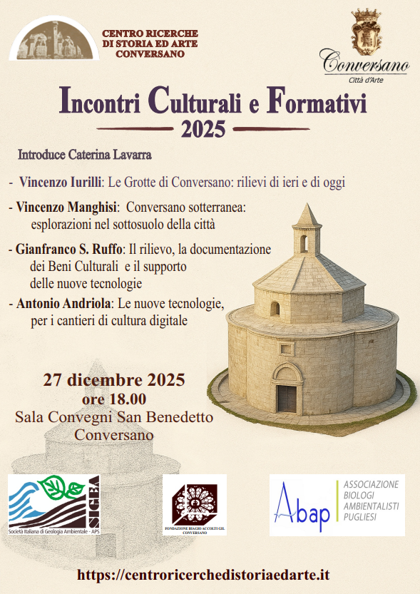 L’incontro del 27 dicembre sarà dedicato in modo specifico a Conversano sotterranea, ripercorrendo le principali esplorazioni nel sottosuolo della città e soffermandosi sul tema delle Grotte di Conversano, attraverso un confronto tra i rilievi storici e le più recenti attività di documentazione.