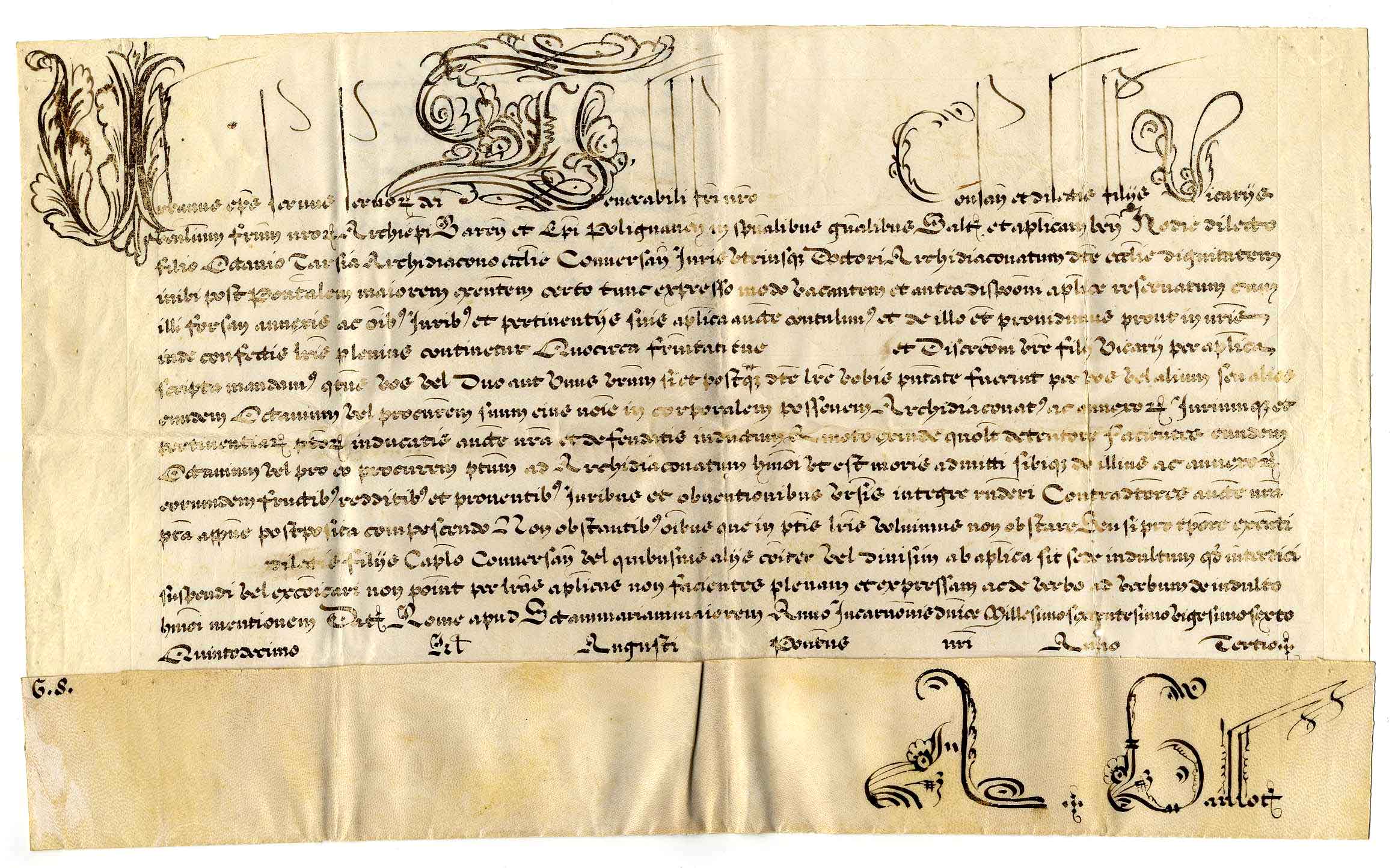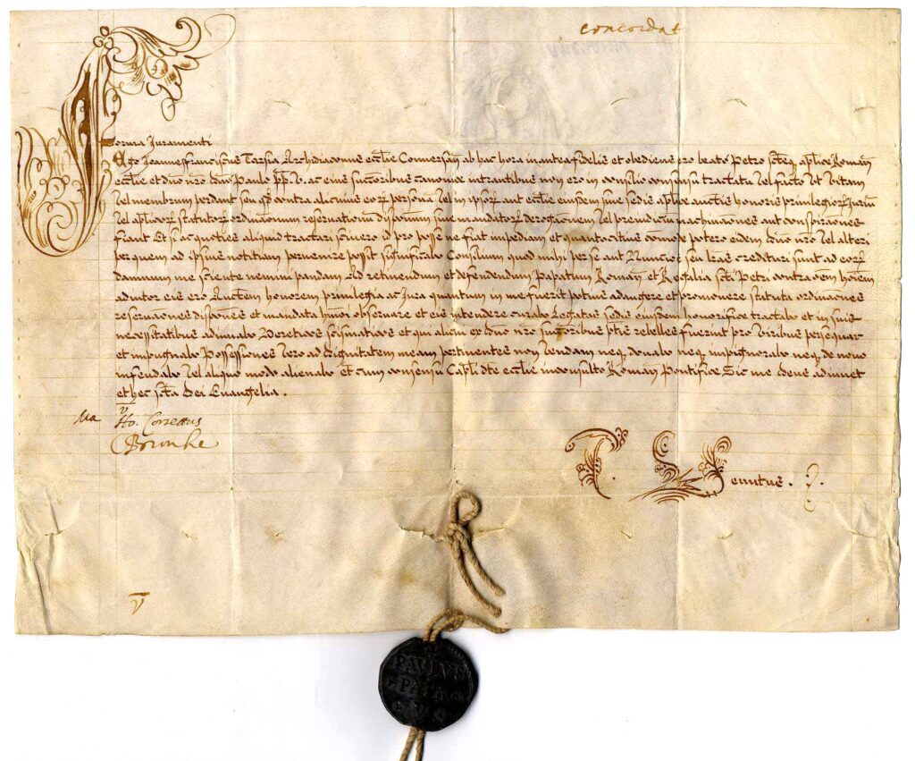 Ma che cos’è – ed in cosa mai consiste –  il fondo pergamenaceo Tarsia? Così com’esplicitamente dichiarato dall’intitolazione stessa del fondo, si tratta delle pergamene (cioè di un insieme di materiali di scritture storiche) che son state religiosamente raccolte e quindi altrettanto ben più gelosamente conservate, nel loro archivio storico, dalla famiglia Tarsia, dal 1347 al 1715.  Come, per altro, analogamente erano portate a fare le famiglie dei notabili del tempo appartenenti alla nobiltà delle professioni e dei commerci.  E non meno poi si adoperavano anche coloro ai quali eran loro state affidate le sorti di una intera plaga o regno. Si tratta, per ciò, di una documentazione di prima mano – non altrimenti reperibile – che la famiglia raccoglieva gelosamente in quanto ciò che conservavano documentava momenti di particolar rilievo ed importanza: non solo ed unicamente per la propria famiglia.