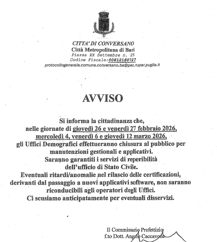 LA COMUNICAZIONE UFFICIALE PUBBLICATO SUL SITO DEL COMUNE DI CONVERSANO
