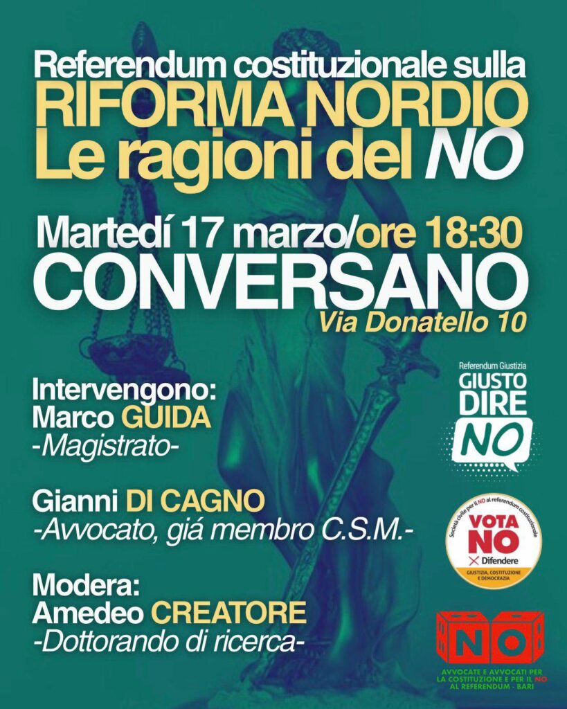 Martedì 17 marzo alle 18.30 nella sede di DOMOS a Conversano (via Donatello, 10) per il NO al quesito referendario saranno il magistrato Marco Guida e l’avv. Gianni Di Cagno, moderati dall’avv. Amedeo Creatore (dottorando di ricerca) a confrontarsi sul tema (vedi locandina)