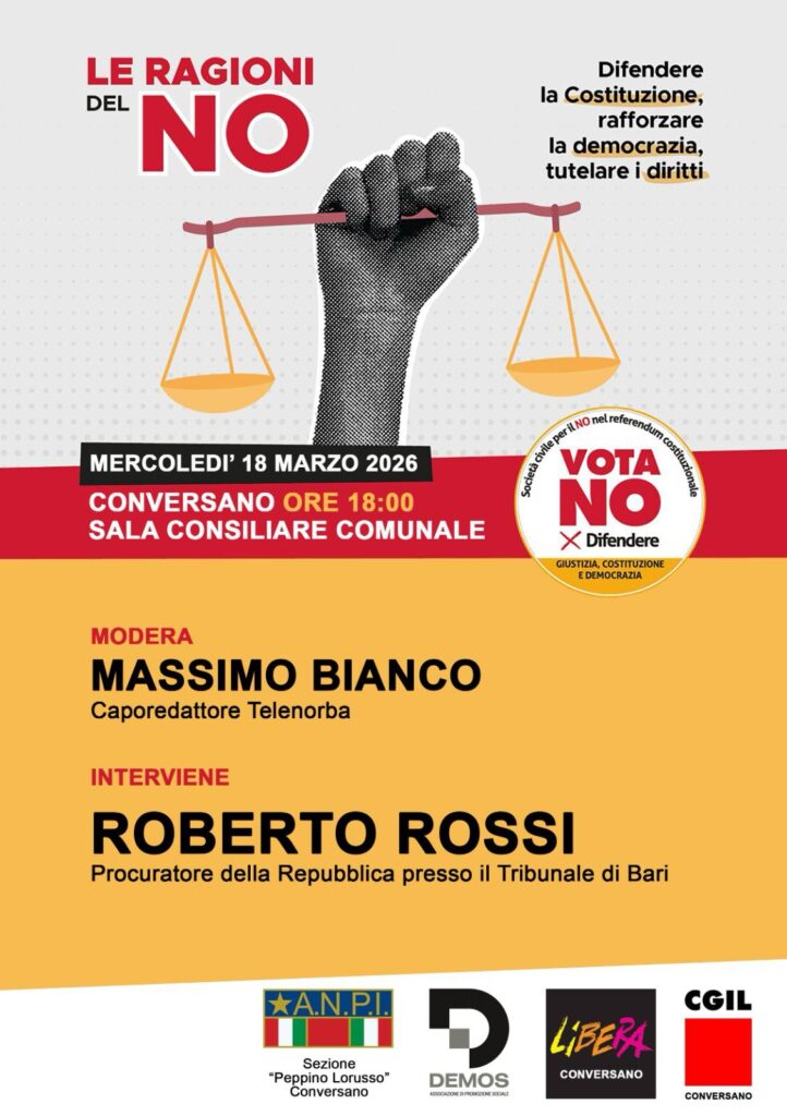 Mercoledì 18 marzo alle 18.00 in sala consiliare nel Municipio di Conversano, per le ragioni del NO al quesito referendario, sarà il Procuratore del Tribunale di Bari, Roberto Rossi, a rispondere alle domande di Massimo Bianco, giornalista di Telenorba (vedi locandina).