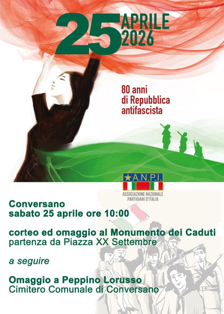 L’ANPI Sez. “Peppino Lorusso” di Conversano comunica che sabato 25 aprile Festa di Liberazione, al termine della deposizione della corona presso il Monumento dei Caduti, si tratterrà per un breve intervento in ricordo delle vittime della guerra di Liberazione, e in omaggio agli 80 anni della nostra Repubblica.
