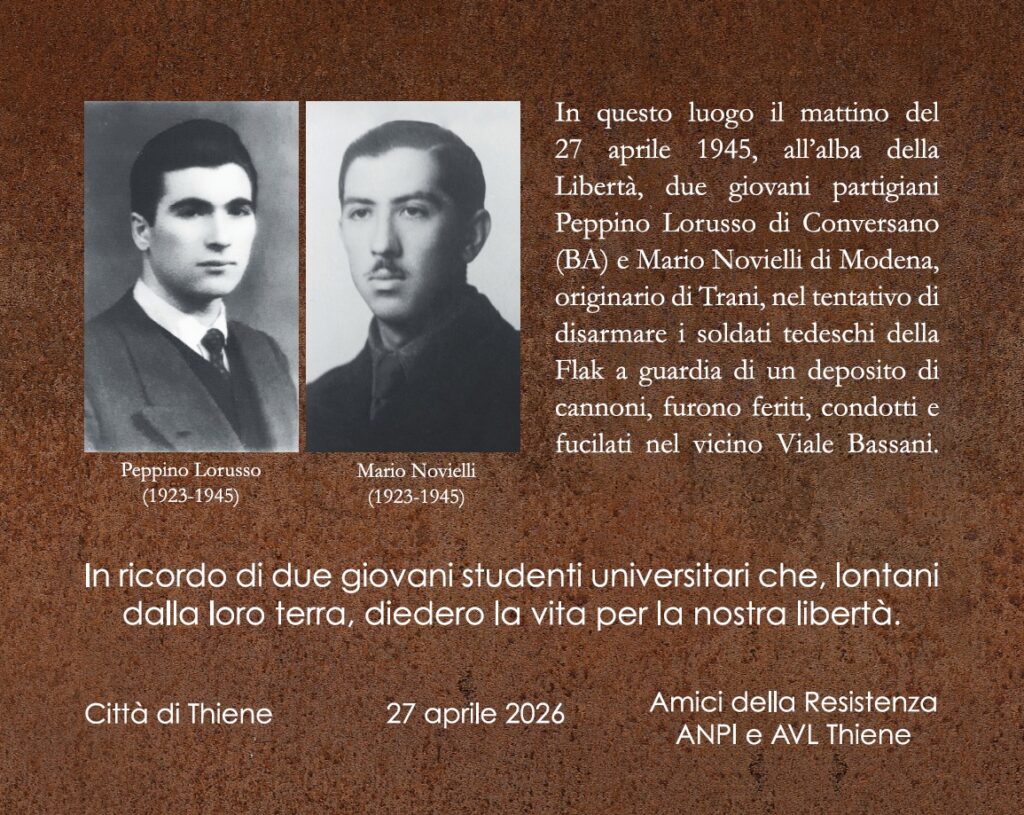 Il 27 aprile p.v. a Thiene, in provincia di Vicenza, sarà scoperta una targa nel piazzale del Bosco